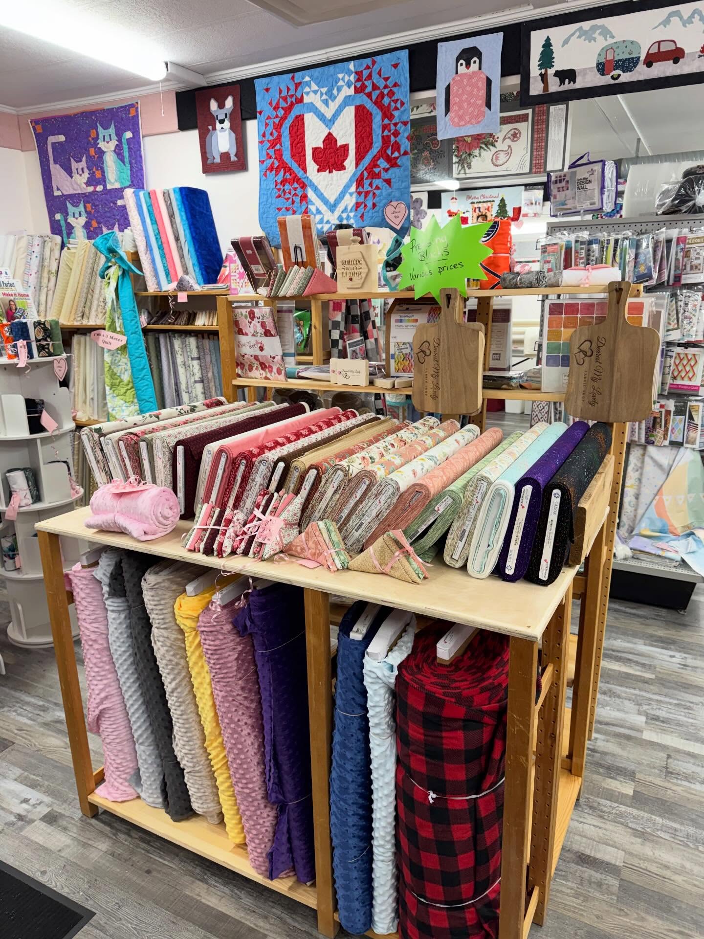 We offer quilting cotton, flannel, Cuddletex, wide-back flannel, wide-back cotton, quilt kits, pre-cuts, notions, quilty trinkets, apparel, digital longarming, and sewing classes!